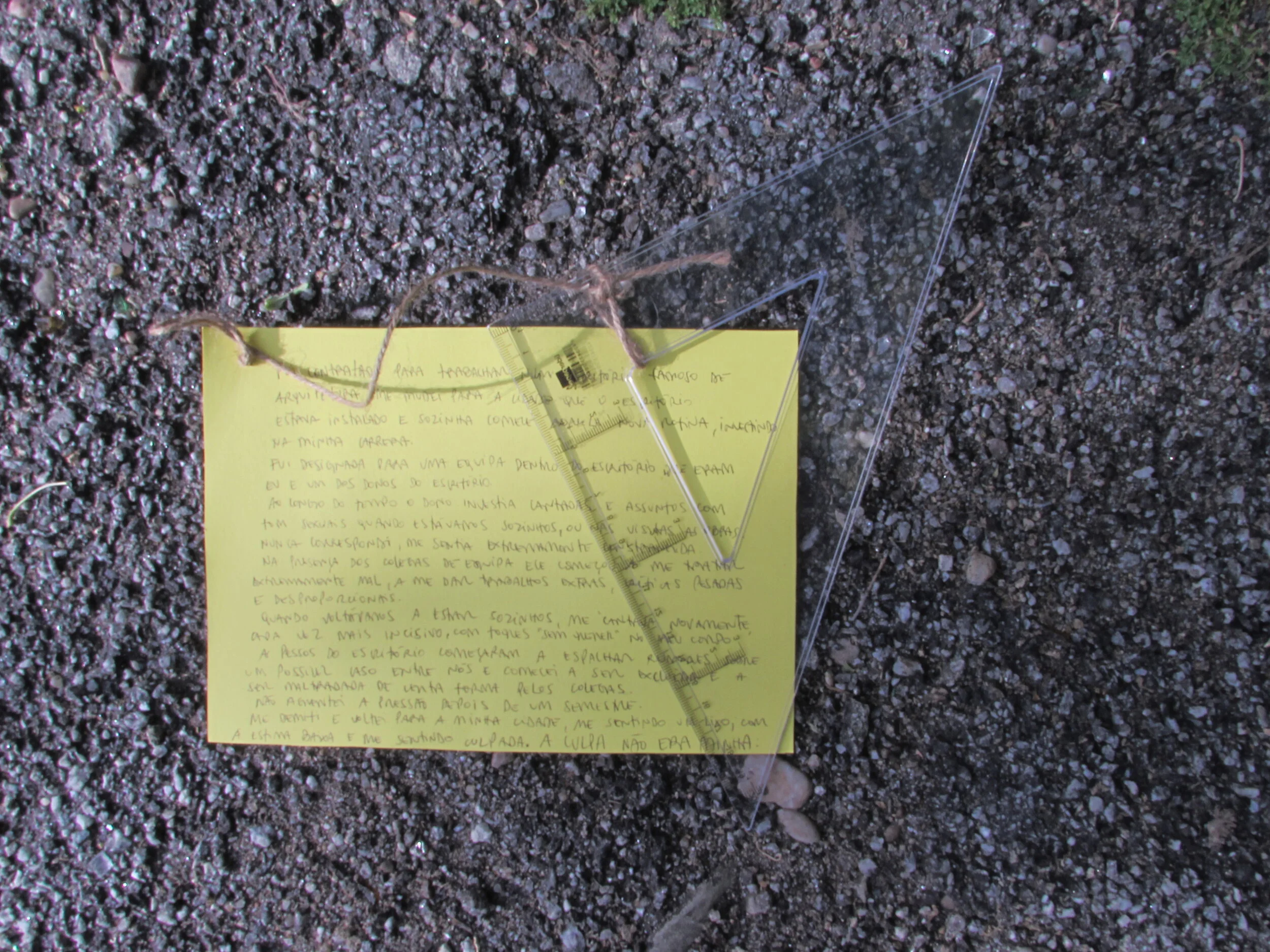 Open installation - The women leave the object and its attached story made during the workshop, in a public space, creating an installation of objects. The installation of objects aims to share a set of harassment narratives, and in a more personal and poetic way, for a woman, the act of leaving the object functions as a ritual of abandonment and liberation.